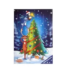 Perinteinen suklaakalenteri, kauniilla jouluisella poro ja joulukuusi kuvituksella.