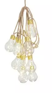 Kymmenen lampun sarja. Jokaisen lampun sisällä kolme lämpimän valkoista lediä. Lampun kupu kirkas, kannan sävy messinkiä. Johdon pinnassa oleva juutti antaa kokonaisuudelle tyylikkään ja... Lue lisää