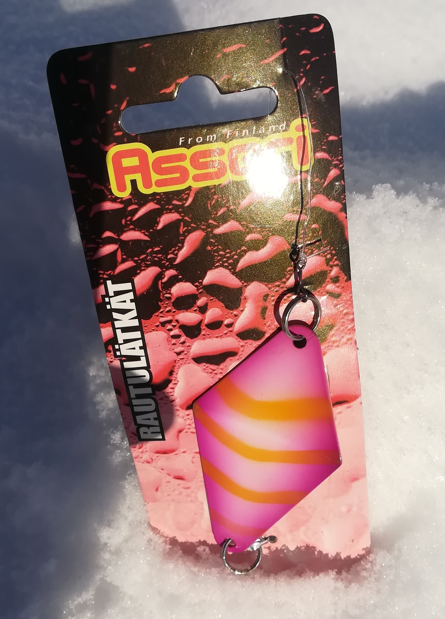 Asseri Jocha Rautupilkki Pinkki keltaisilla raidoilla.