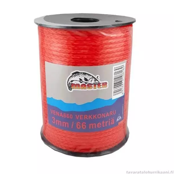 Oranssin värinen kelluva verkkonaru. Narun paksuus 3mm ja rullassa on 66 metriä narua.
