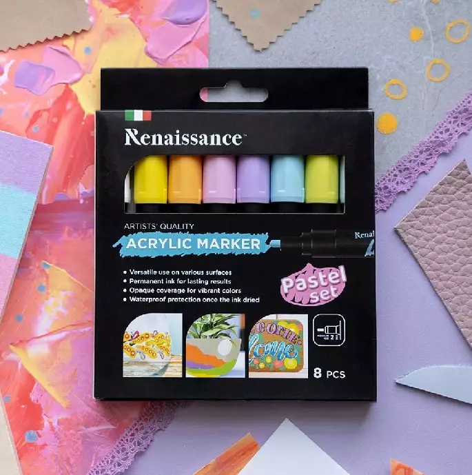 Renaissance akryylitussit sopivat useimmille materiaaleille mm. paperille, pahville, maalauspohjille, puulle, tekstiileille, kivelle, useimmille muoveille, metallille, lasille ja keramiikalle. Piirtojälki on peittävä ja kuivuttuaan vedenkestävä. Piirtojälki 2 mm.