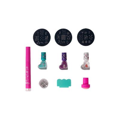 Create it! Kynsien koristelusetti Pakkaus sisältää kolme kynsilakkaa, sabluunat, puutikun, leimasimen ja koristelu timantit. Ikäsuositus 6+