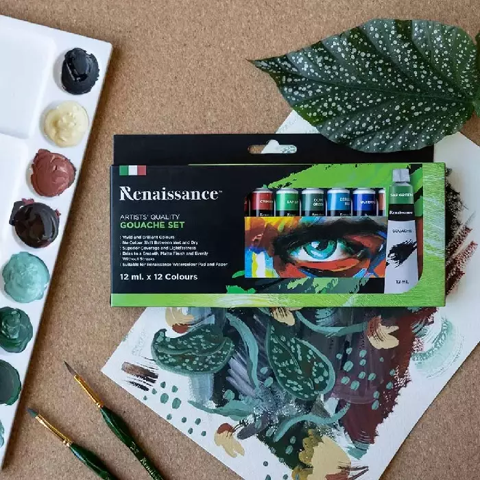 Renaissance guassivärit ovat vesiohenteiset, pigmentti on vahva ja värit toistuvat kirkkaina. Guassivärien lopputulos on peittävä ja mattapintainen.