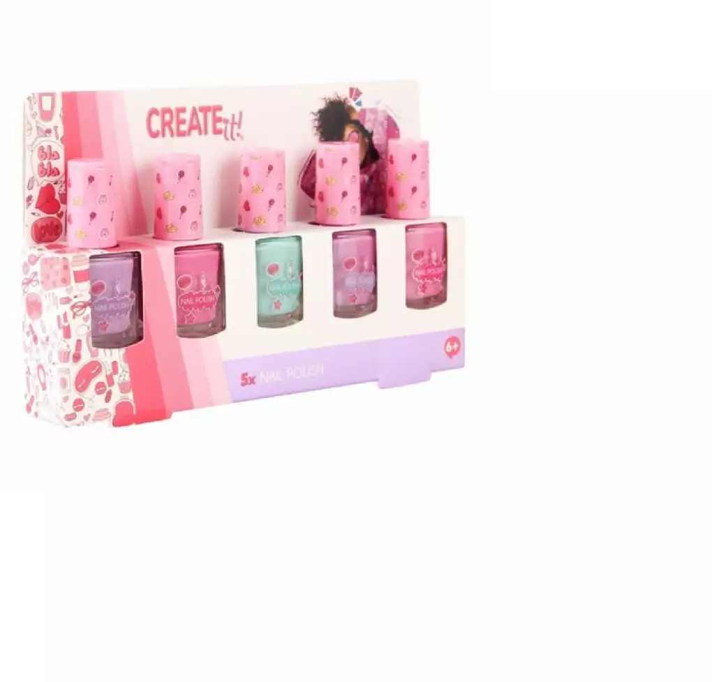 Viisi eriväristä lakkaa sisältävä kynsilakkasetti. Create It! setin lakat ovat pirteän värikkäitä ja miellyttävän tuoksuisia. Ei alle 6-vuotiaille lapsille.