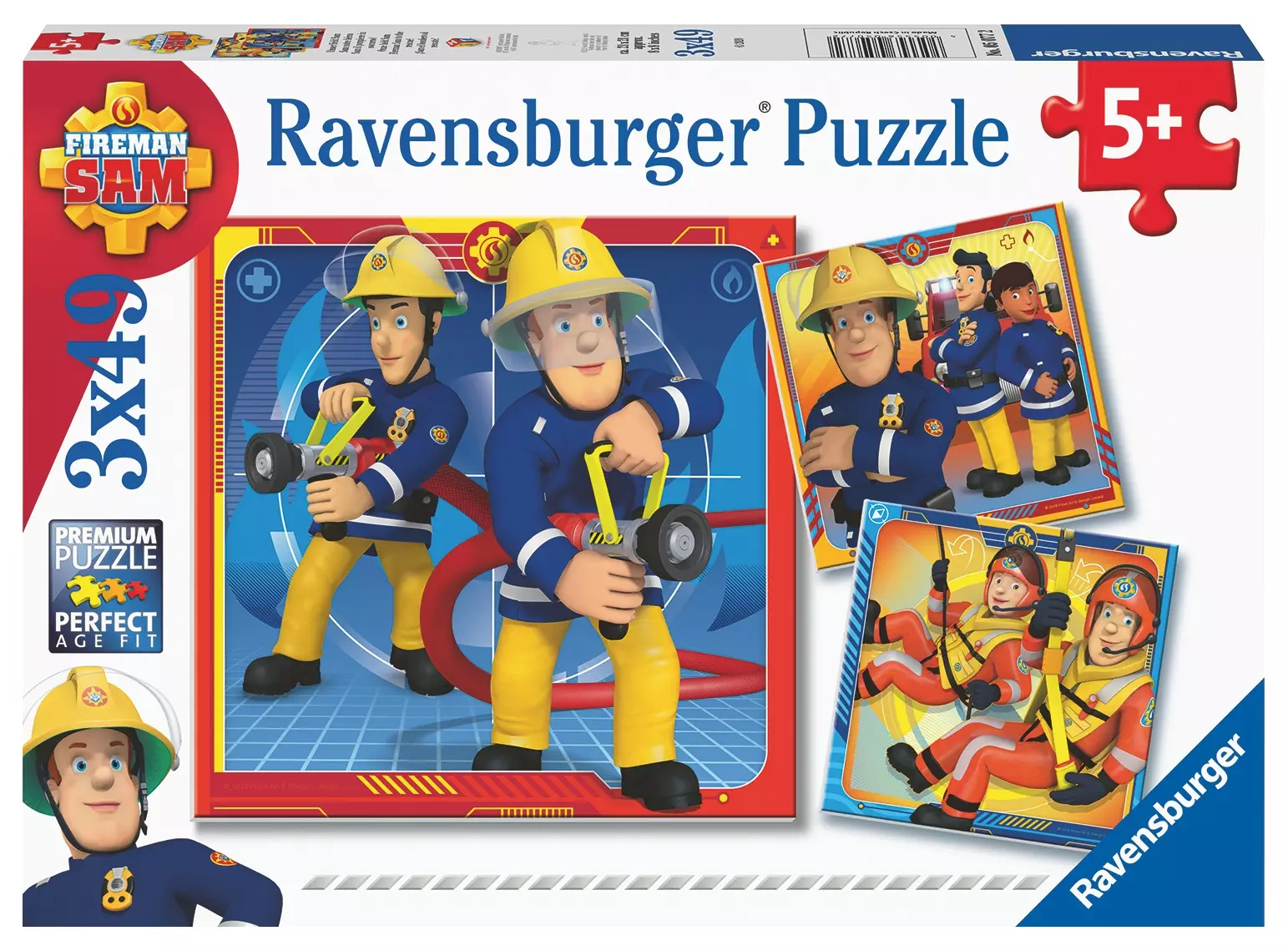 Fireman Sam To The Rescue -palapeli! Pakkauksessa on kolme palapeliä, joissa kussakin on 49 palaa.