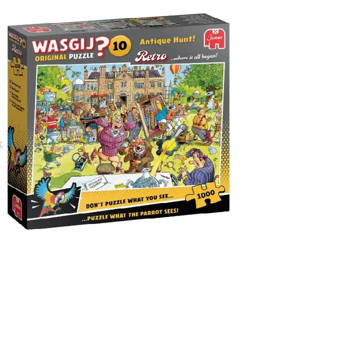 Tuhannen palan sarjakuvapalapeli Wasgij Antique Hunt!. Kuvassa antiikin metsästäjiä kaaoksen keskellä.