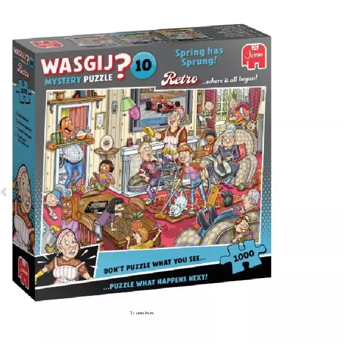 Tuhannen palan palapeli Wasgij Spring has sprung. "Mysteeripalapeli" tarkoittaa, että laatikon kuva ei täysin vastaa palapelin kuvaa.
