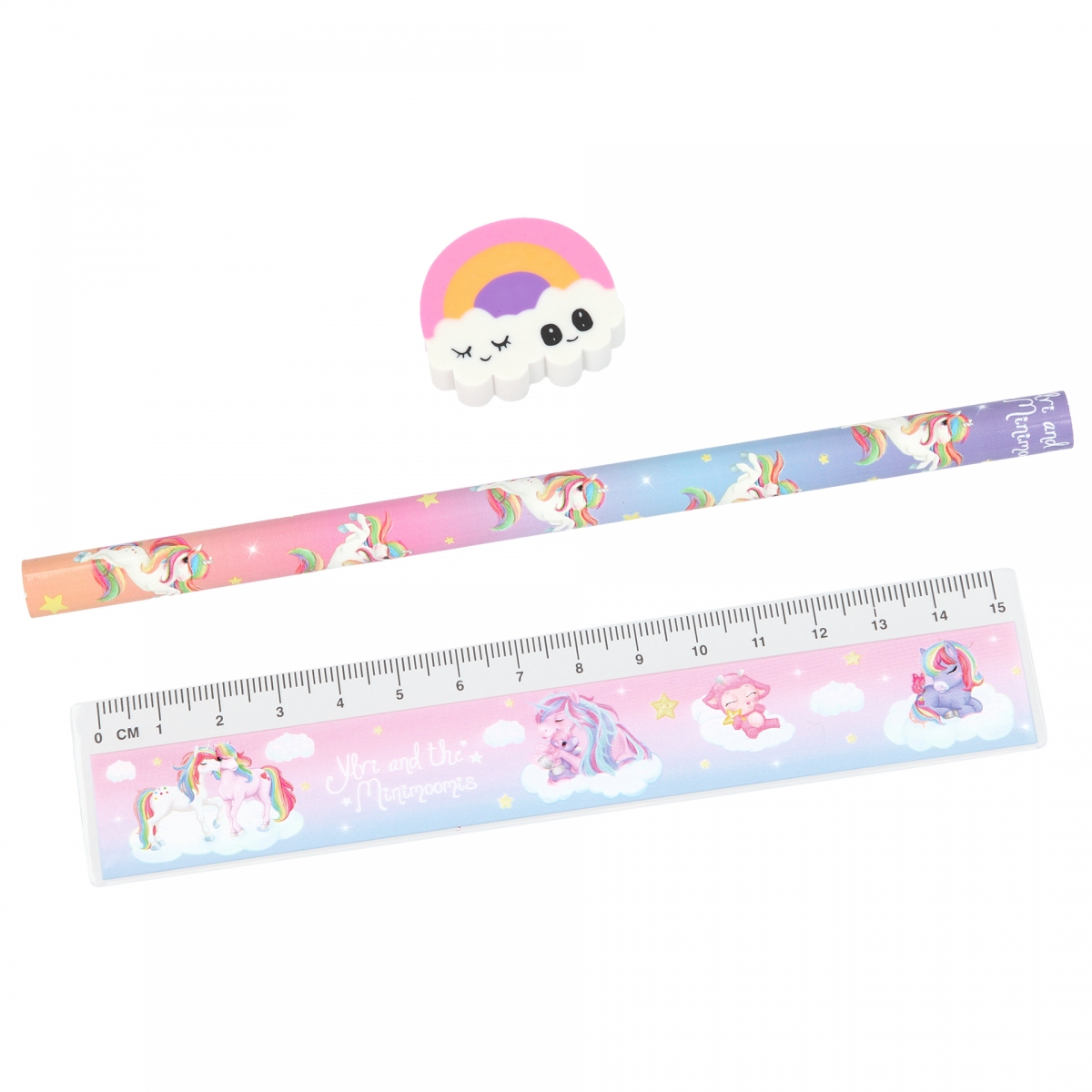 Ylvin suloinen yksisarviskaveri Naya ihastuttaa tässä ihanan värikkäässä koululaisen tarvikesetti! Sisältää: - Kynä - Viivotin - Kumi Ikäsuositus: +5v.