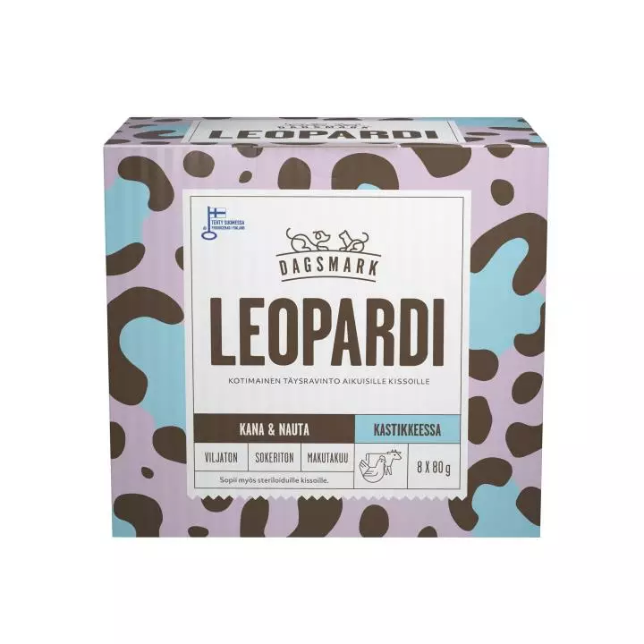 DM LEOPARDI on kotimainen kissan täysravinto, joka on suunniteltu tukemaan kissasi hyvinvointia. Tämä maukas ja proteiinipitoinen ruoka sisältää suomalaista kanaa ja nautaa herkullisessa kastikkeessa. Dagsmark LEOPARDI tarjoaa kissalle kaikki tarvittavat vitamiinit ja kivennäisaineet, jotka edistävät sen terveyttä ja hyvinvointia.