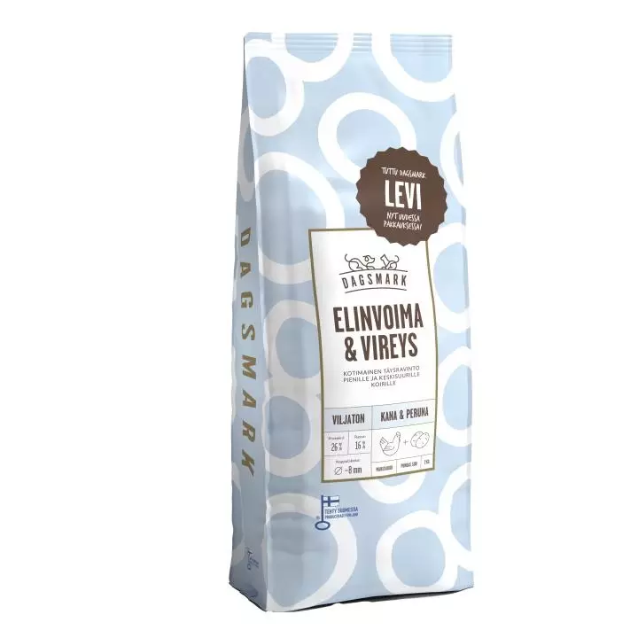 Dagsmark Elinvoima & Vireys viljaton kana on kotimaista kanaa ja perunaa sisältävä kuivaruoka. Merileväöljy on hyvä omega-3- ja -6-rasvahappojen lähde, jotka ravitsevat koiran turkkia ja ihoa. Pienempi maistuva nappula takaa riittävän energian saannin nirsoimmillekin koirille. Reseptissä on huomioitu pitkäikäisten koirien hampaita, sydäntä ja niveliä. Sisältää C-vitamiinia, tauriinia, L-karnitiinia ja natriumheksametafosfaattia.