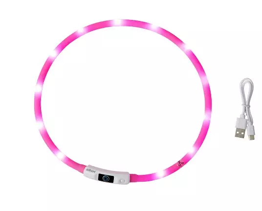 USB-ladattava led-valopanta koiralle. Panta on valmistettu kevyestä, pehmeästä ja joustavasta silikonista. Enimmäismitta 70 cm, pannan voi lyhentää sopivaksi.