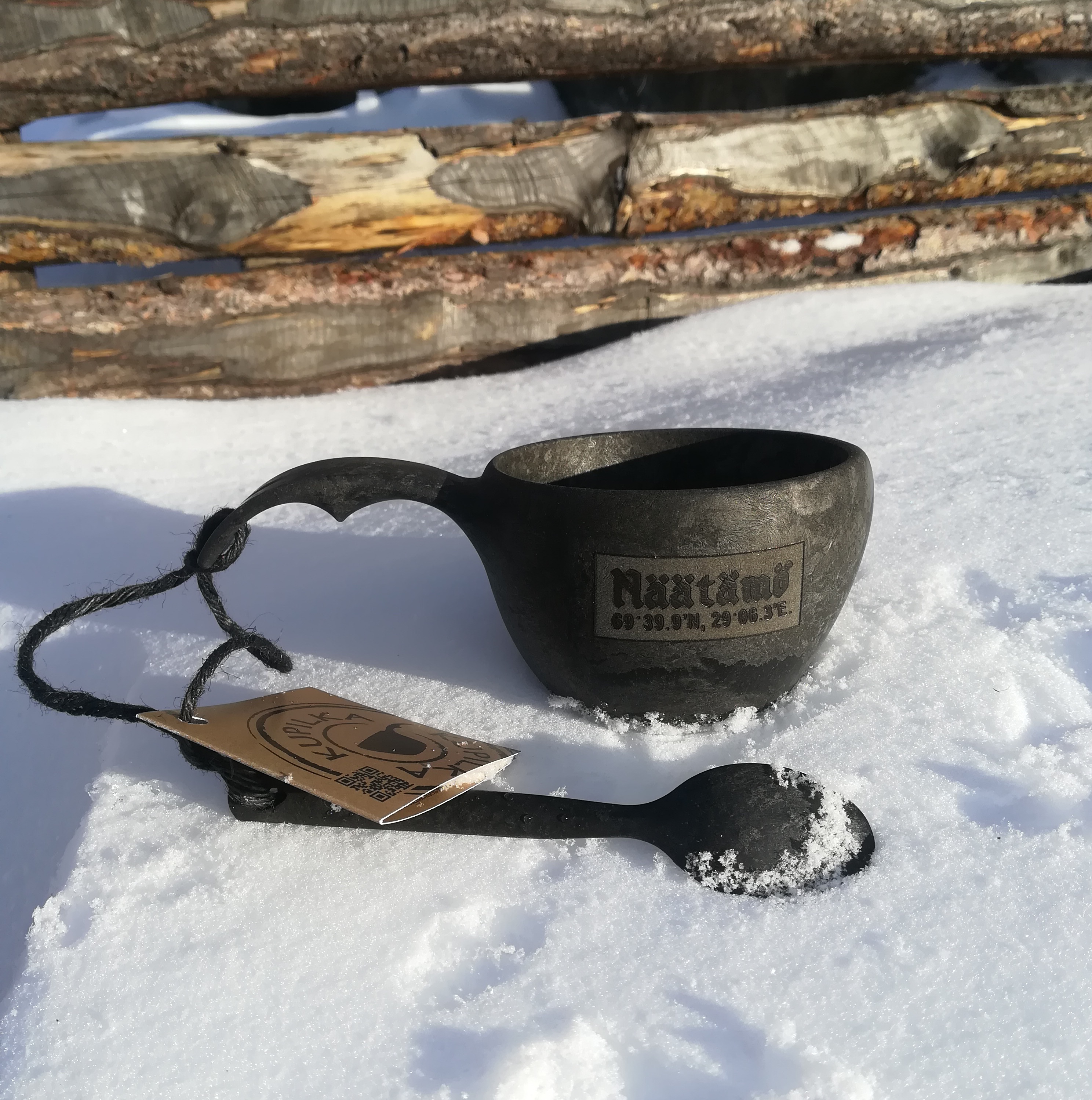 Eräjuoma-astia Näätämö logolla ja lusikalla.