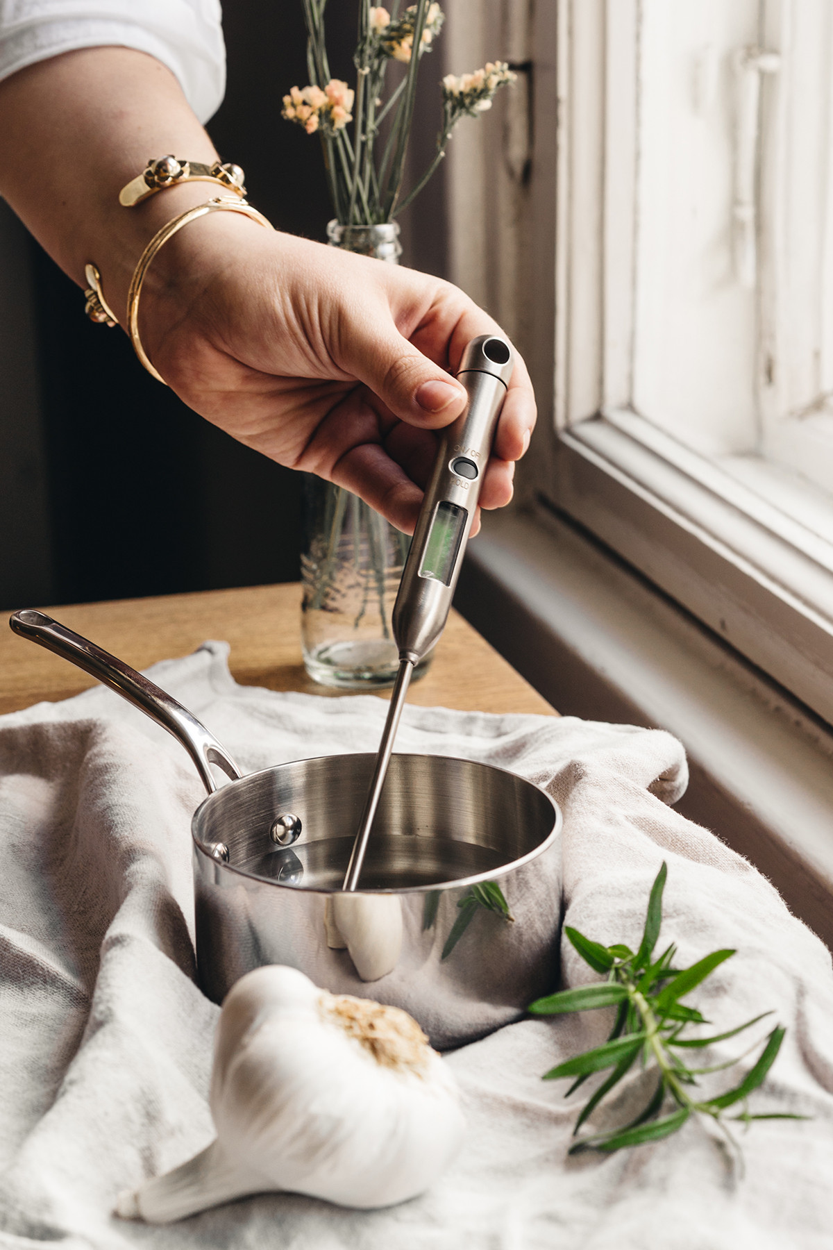 Teräksestä valmistetun digilämpömittarin avulla seuraat esim. kuumennettavan nesteen lämpötilaa kastikkeiden valmistuksessa tai vaikka macaron-leivosten valmistuksessa. Erinomainen onnistuneen kinuskin valmistukseen tai viinin tarjoilulämpötilan mittaamiseen!