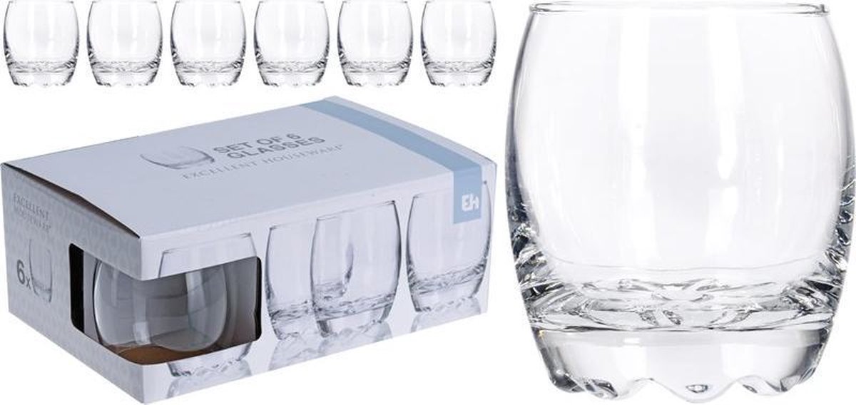 Kauniin sulavalinjaiset pyöreähköt juomalasit Excellent Housewarelta sopivat niin arkeen kuin juhlaa! Sisältää 6 kpl juomalaseja. Lasin koko: 275 ml