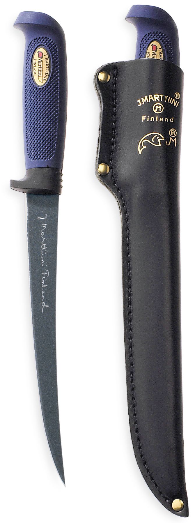 Terä on valmistettu ruostumattomasta kromiteräksestä ja sitä suojaava pinnoite tekee terän puhdistamisen helpoksi, pelkkä huuhtaisu riittää. Karhennettu kumikahva ja sormisuojahela takaavat pitävän otteen veitsestä kaikissa olosuhteissa. Tämä teräpituus soveltuu parhaiten noin 2-3 kg:n painoisen kalan fileointiin. Veitsi on myös erinomainen apuväline monissa muissakin keittiöaskareissa. Filetissä on musta nahkatuppi.