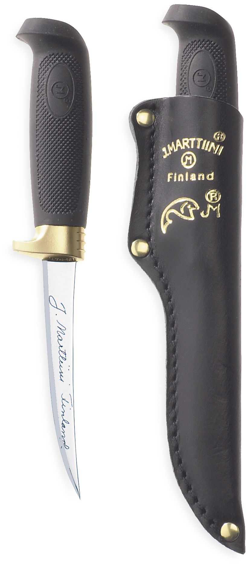 Huippuunsa hiotulla, terävällä ja notkealla ruostumattomasta kromiteräksestä valmistetulla terällä saat kauniita fileitä helposti. Tämä pikkufiletti on erinomainen esimerkiksi pikkuahvenien käsittelyyn. Musta nahkatuppi.