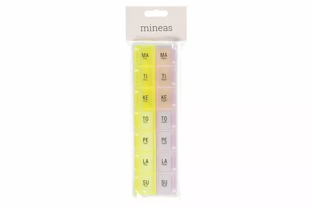Kätevän kokoinen lääkeannostelija viikon ilta- ja aamu lääketarpeeseen. Erinomainen esimerkiksi matkoilla. Helppo täyttää ja käyttää.