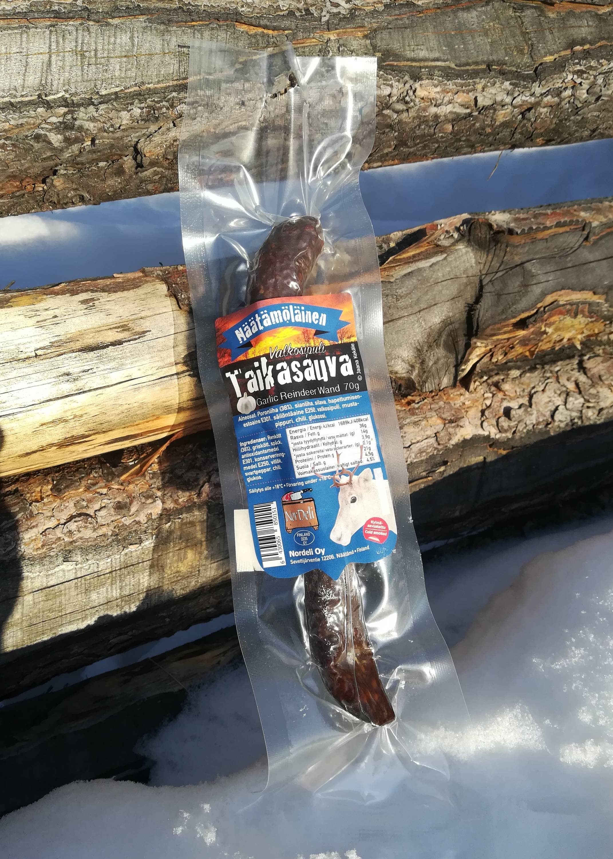 Ainesosat: Poronliha (38%), sianliha, silava, hapettumisenestoaine E301, säilöntäaine E250, valkosipuli, mustapippuri, chili, glukoosi.