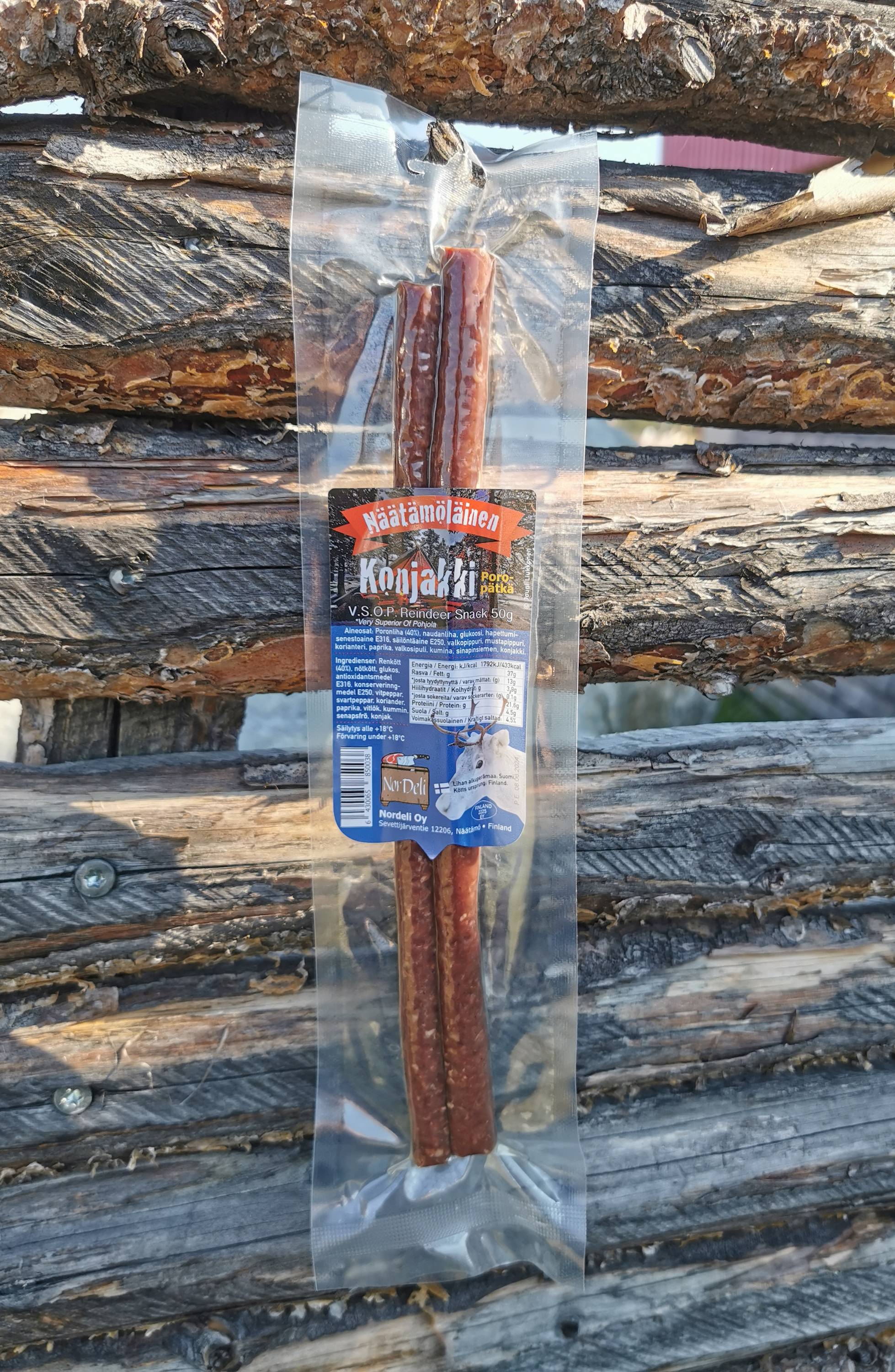 Näätämössä valmistettu kylmäsavustettu ja ilmakuivattu espanjalaistyylinen poron ja naudanlihasta valmistettu kestomakkara Konjakki Poropätkä! Maku: Konjakki. Ainesosat: Poronliha (40%)... Lue lisää
