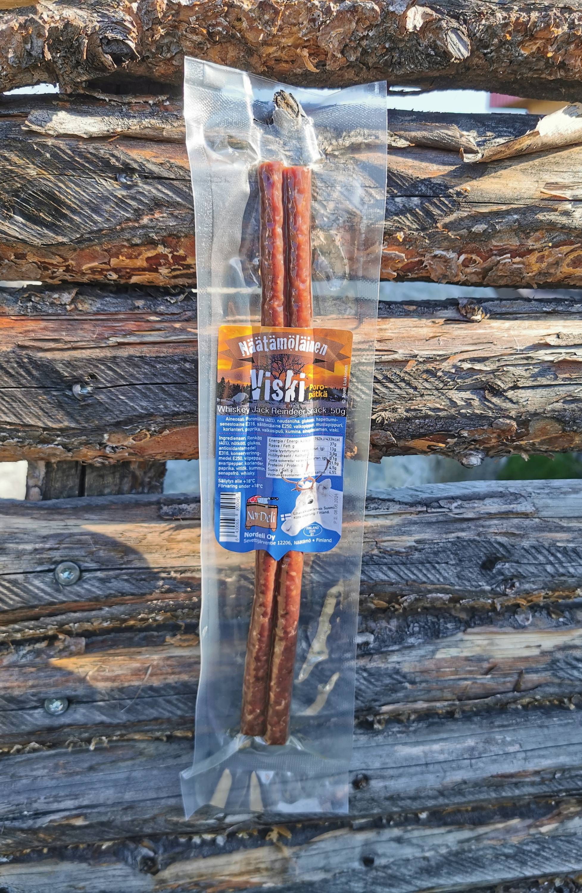 Näätämössä valmistettu kylmäsavustettu ja ilmakuivattu espanjalaistyylinen poron ja naudanlihasta valmistettu kestomakkara Viski Poropätkä!