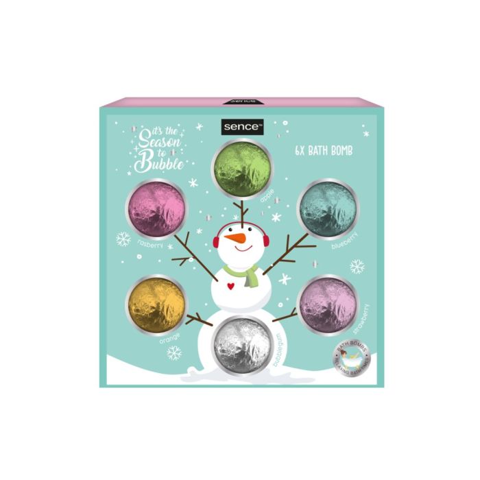 Kuusi ihastuttavaa kylpypommia lahjapakkauksessa. Tuoksuina vadelma, omena, mustikka, appelsiini, purukumi ja mansikka.