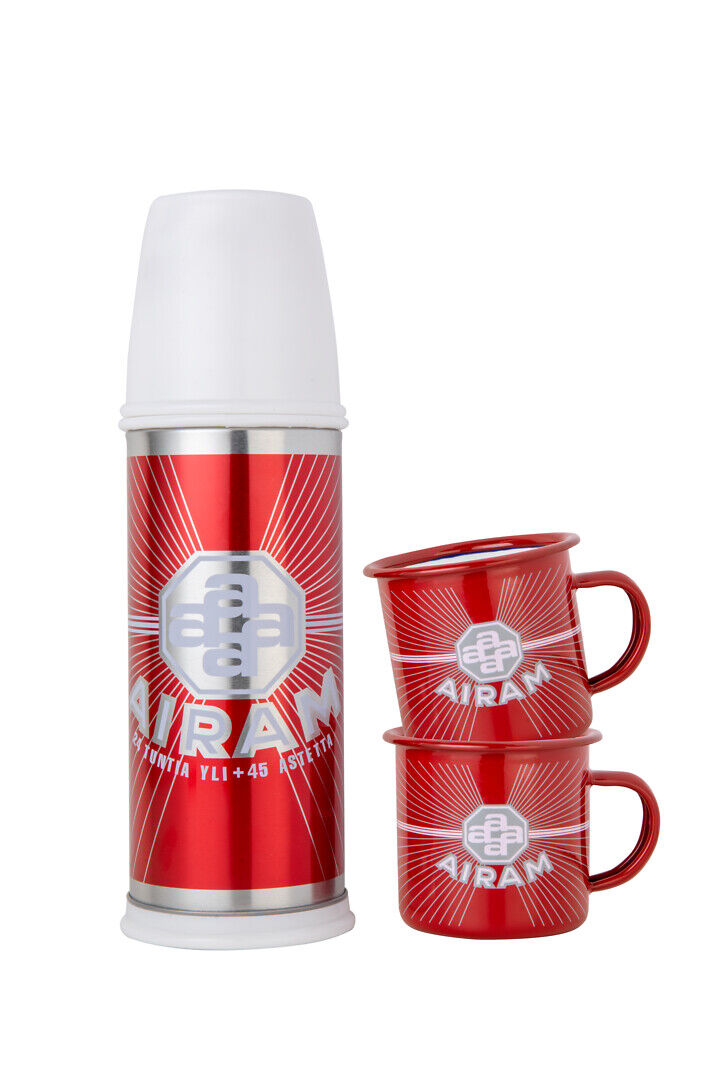 Airamin punainen Klassikko-termospullo kuuluu Suomen suveen, laiturille, hiihtoretkelle, kahvipöytään, pilkille, työpäivään… Jos suomalaiselle sanoo sanan "termos", aika monen mieleen nousee ikoninen punainen mielikuva ja höyryävä herkullinen juoma. Juhlasetti sisältää yhden Klassikko-termospullon ja kaksi emalimukia iki-ihanalla Klassikko-kuosilla.