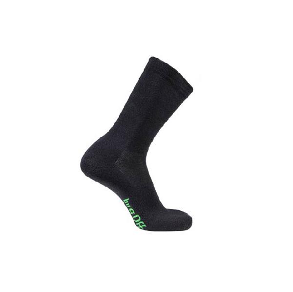Runsaasti puuvillaa sisältävät mustat unisex sukat vihreällä bugOff logolla.
