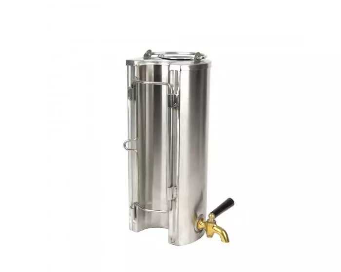 Ruostumattomasta teräksestä tehty lämminvesivaraaja. Tilavuus n.3litraa. Kiinnitetään kaminan piipun ympärille integroiduilla kiinnittimillä,putken halkaisija 60mm. Messinkinen hana. Varaajan yläosassa avattava pieni luukku veden täyttöä varten ja koko yläosan voi ottaa pois pesua varten. Ylhäällä myös kantokahva.