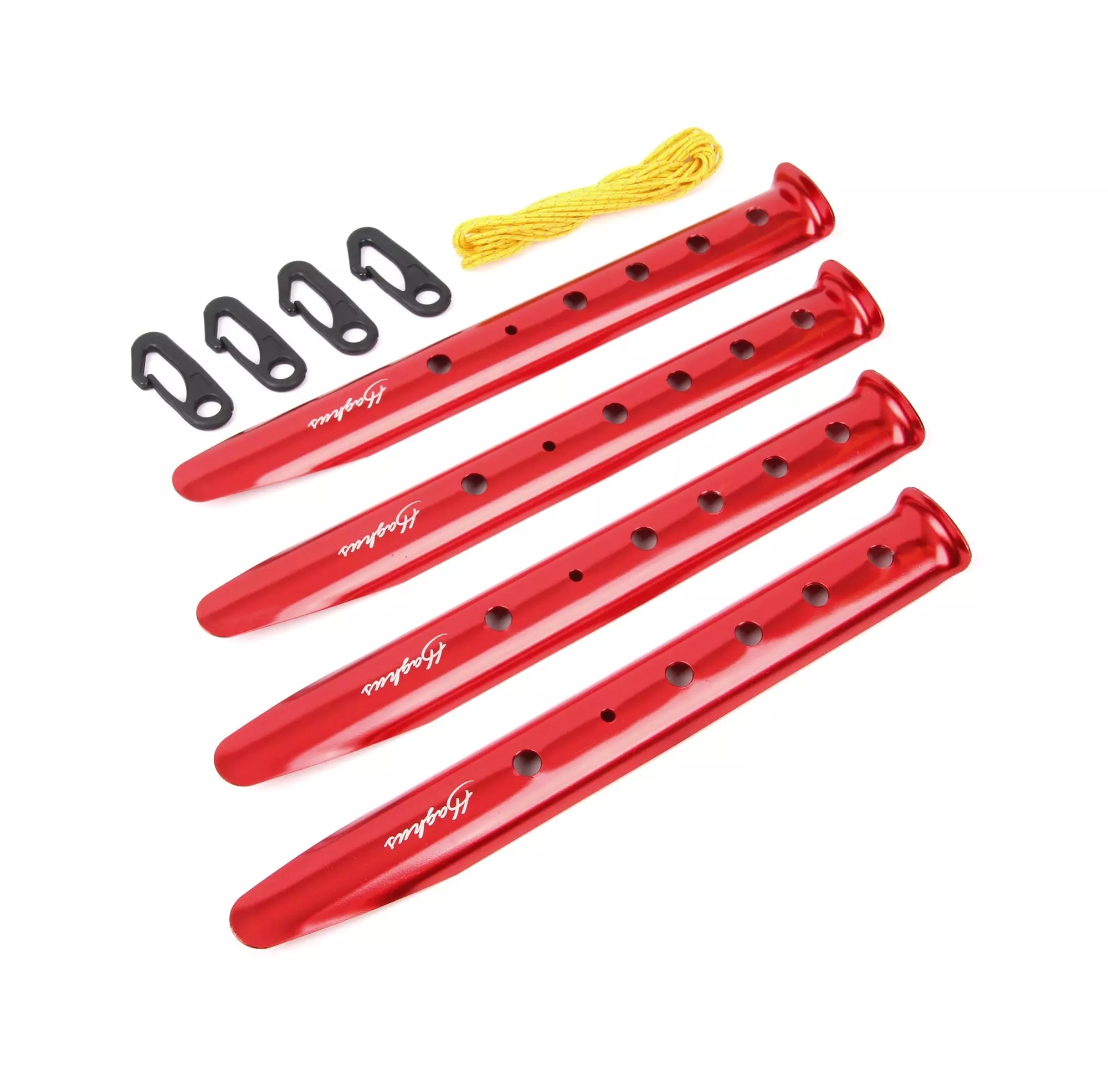 Pakkaus sisältää 4x telttakiila, 4x 50cm naruja ja 4x pikahakoja.