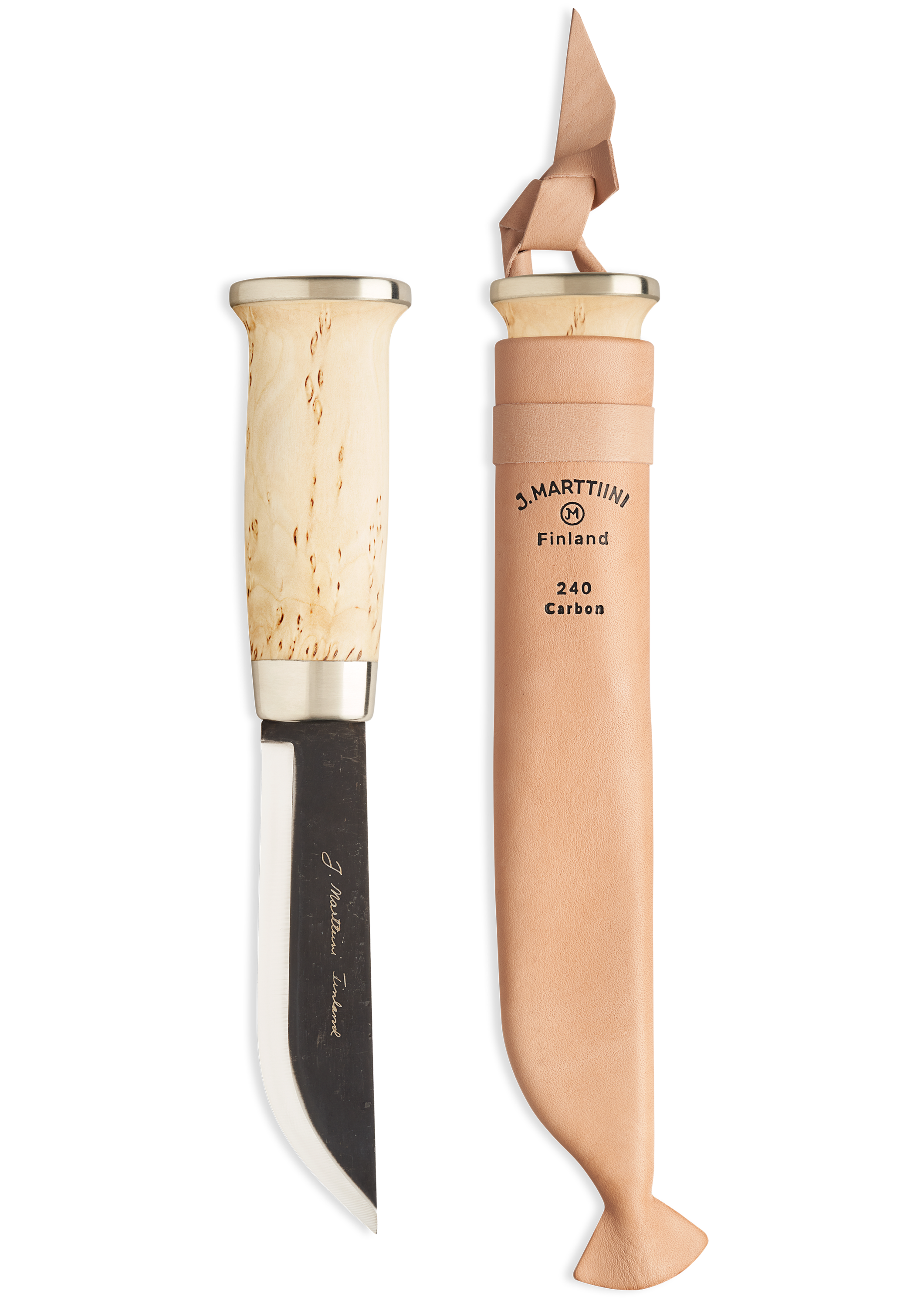 Marttiinin komea ja käytännöllinen Hiilileuku 240 puukko soveltuu moneen tarkoitukseen, ja säännöllisellä huolenpidolla leukun hiiliterästerä pysyy pitkään hyvänä ja ruosteettomana.
