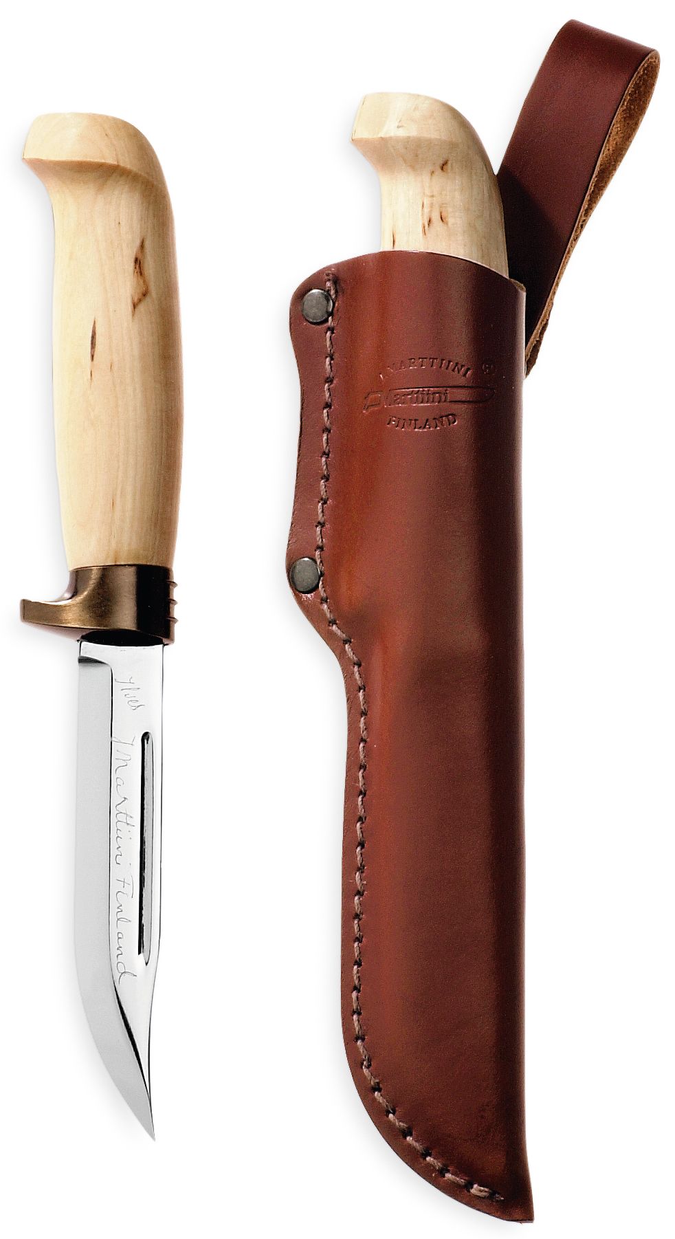 Kaunis vahattu visakoivukahva sormisuojaheloineen istuu tukevasti käteen.