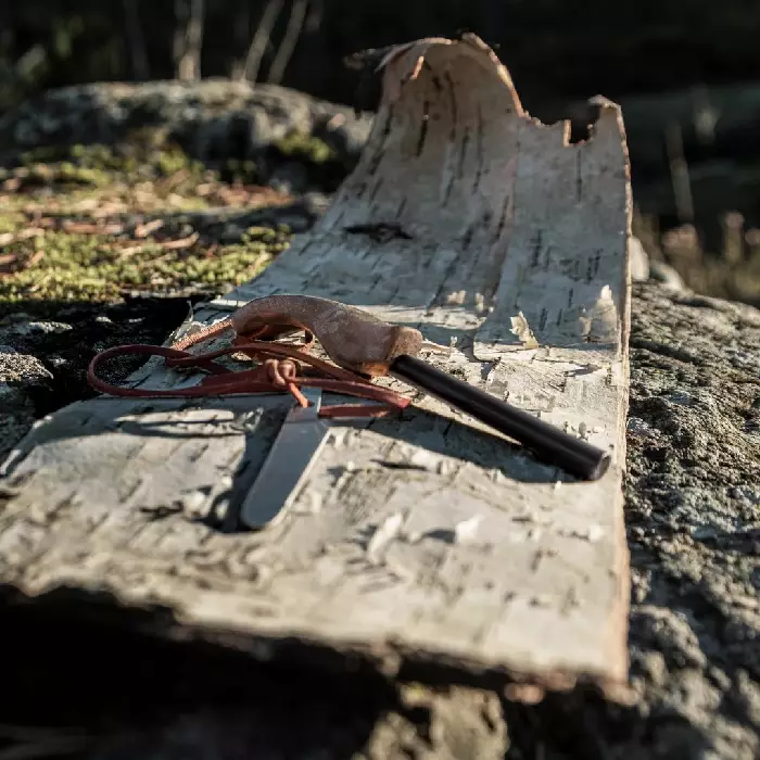 Sekä tulustikku, että raapaisurauta solmitaan poronnahkaiseen nauhaan, jolla solmit tuotteen esimerkiksi vyölle tai repun sivuun.