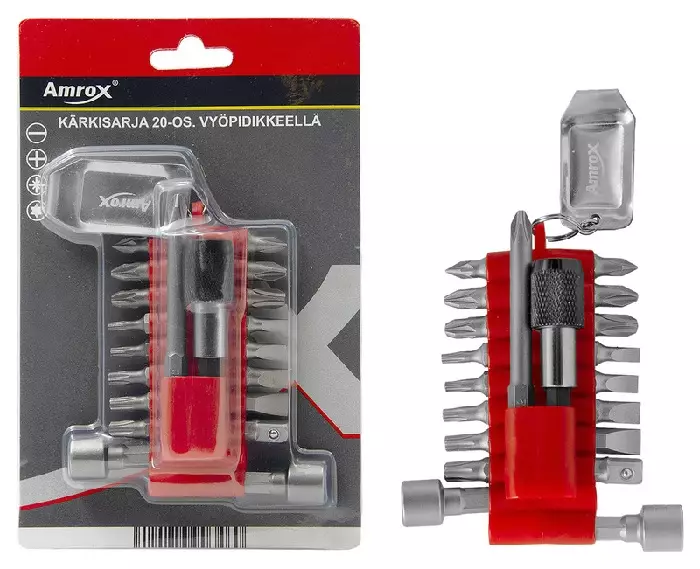 20-osainen Kärkisarja Amrox. sarja sisältää: -15 kpl ruuvauskärkiä 25 mm (S2) -uraruuvi 4.0, 5.0, 6.0 ja 7.0 mm -T10, T15, T20, T25 ja T30 -PH1, PH2 ja PH3 -PZ1, PZ2 ja PZ3 -1 kpl ruuvauskärki... Lue lisää
