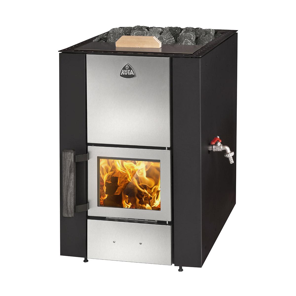 Tehokas Kota Kuru puukiuas on nyt saatavana eteen sijoitetulla vesisäiliöllä varustettuna. Käytännöllisesti muotoiltu etuvesisäiliökiuas mahtuu helposti kapeampaankin tilaan. Kiukaan mustaksi maalattu teräsvaippa rst-etulevyllä luo saunaan pelkistettyä tyylikkyyttä.