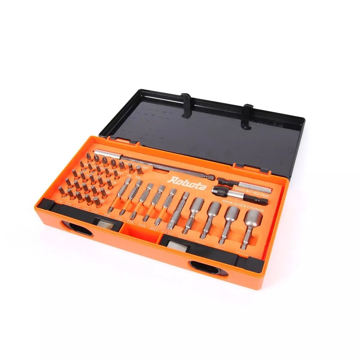 Robota ruuvivääntimen kärkisarja 41-osaa. Ruuvauskärjet soveltuvat myös iskeville ruuvivääntimille. sarja sisältää: Kärki 25 mm Ph1 x 1kpl, Ph2 x 3kpl, Ph3 x 1kpl, T10 x 2kpl, T15 x 3kpl, T20 x 6kpl, T25 x 6kpl, T27 x 2kpl, T30 x 1kpl, H4 x 1kpl ja H5 x 1kpl. Kärki 50 mm T20 x 2kpl, T25 x 2kpl ja Ph2 x 1kpl. Hylsyt 7mm, 8mm, 10mm ja 13mm. Magneettipidin 60mm ja 150mm. Kärjenpidin pikalukolla 60mm ja hylsyadapteri 1/4".