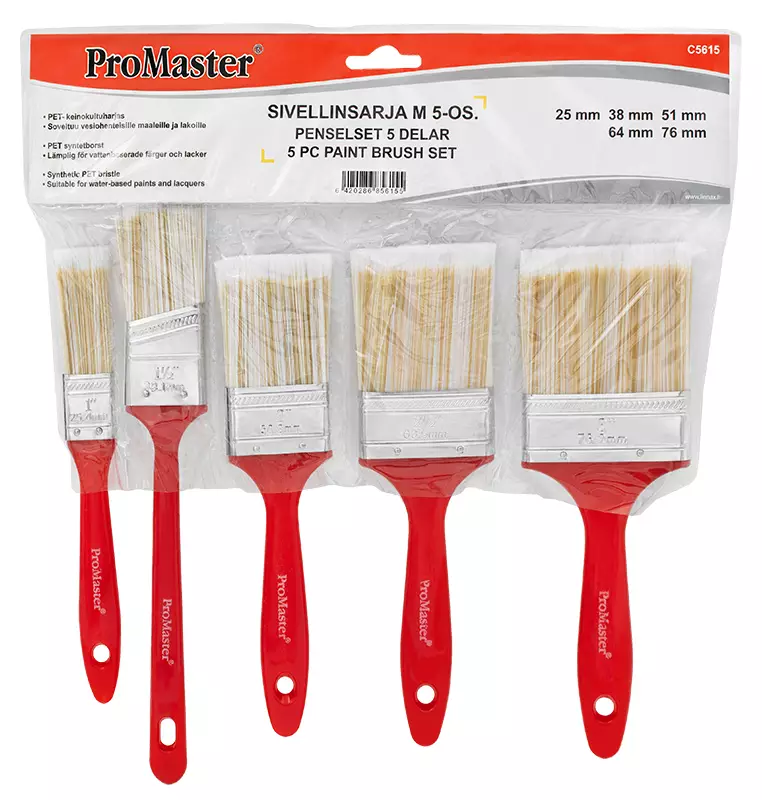 - Sarja sisältää 25mm, 38mm, 51mm, 64mm ja 76mm siveltimet muovivarrella