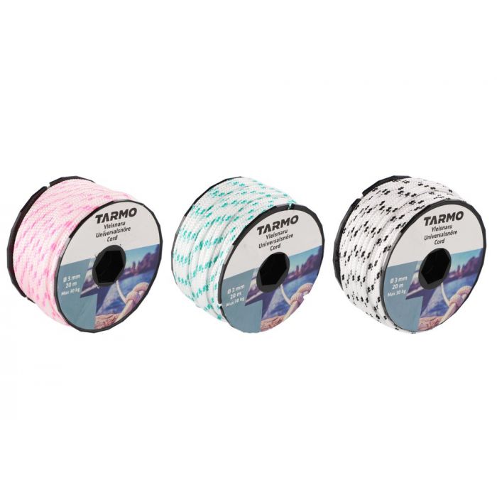 3 mm x 20 m. Värilajitelma. 16-säikeinen punos kerässä. UV-suojattu. Kelluva. Murtolujuus 30 kg. Venyvyys 26 %.