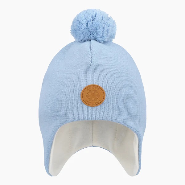 Kokovuori puuvillaa ja elastaania. Korvien kohdalla fleece toppaus. Kuoma merkki etuosassa. Tupsu päällä.