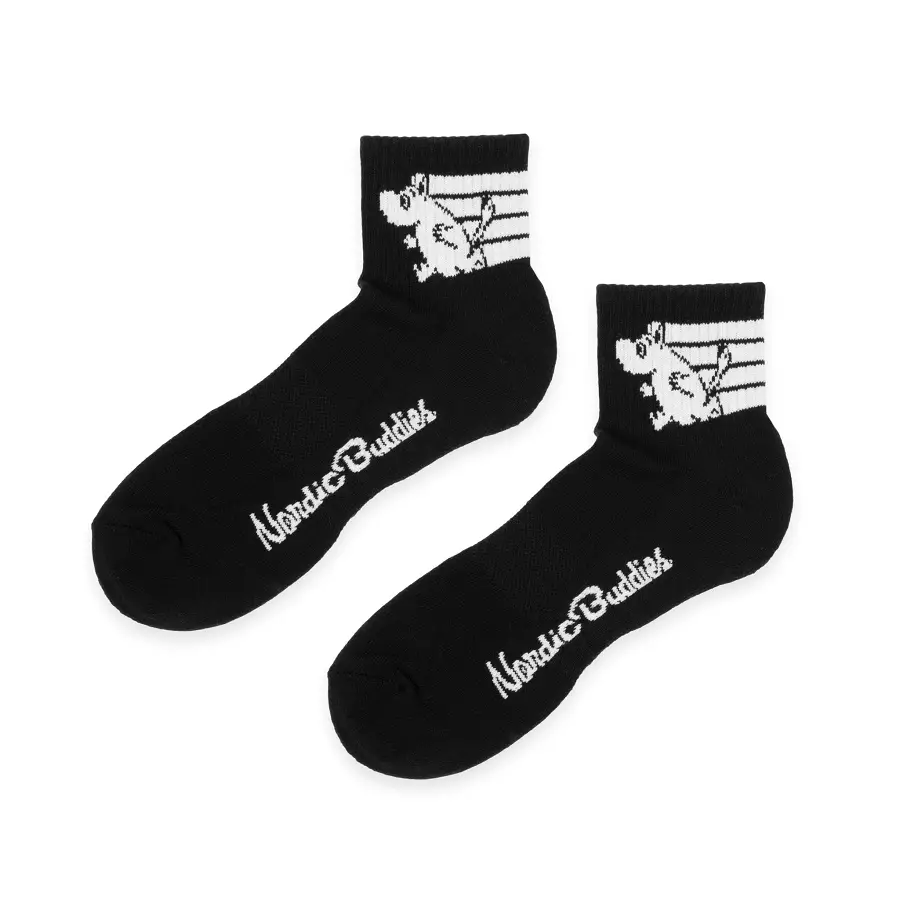 Viralliset Muumi-nilkkasukat mustana, joissa klassinen Muumipeikko-design. Matalavartinen malli sopii täydellisesti tennareiden ja vapaa-ajan käyttöön.