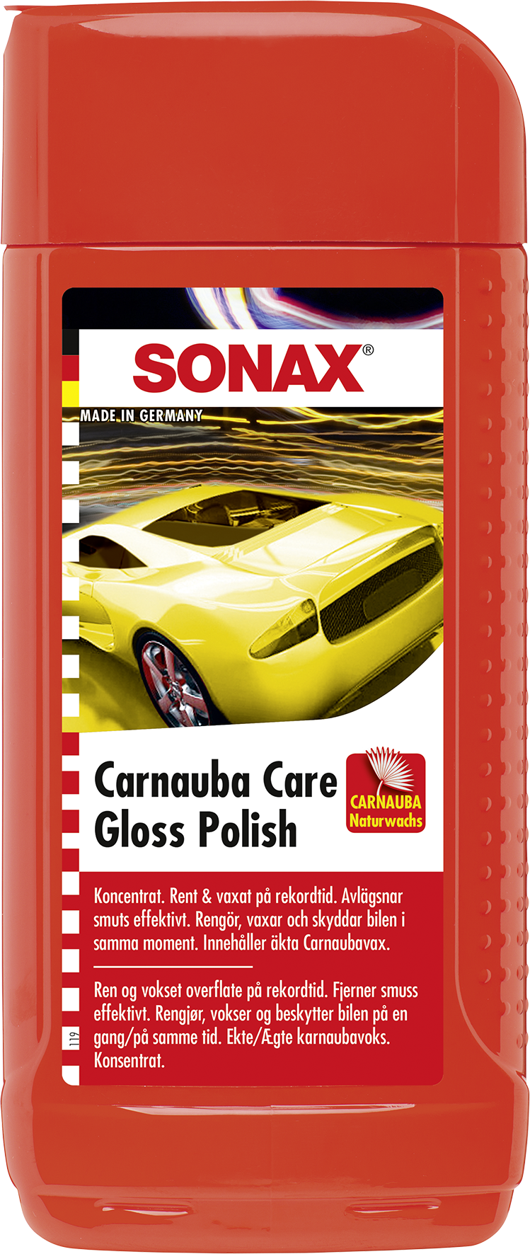<p>SONAX Rengjørende Carnaubavoks 500mlRengjørende Carnaubavoks som fjerner oksidasjon og små riper umiddelbart, og gir fantastisk glans. Unik formel reduserer arbeidstiden betraktelig. Kan også påføres maskinelt.</p>