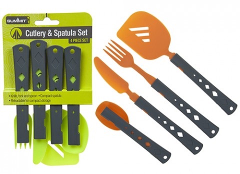 Summit 4-delt bestikksett inneholder kniv, gaffel, skje og stekespade og er ideell for camping da det er lett, kompakt, lett å rengjøre og lagre.