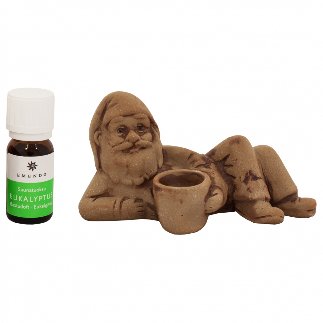 "Badstuegnomen med sin topplue, med en knapp på sin drakt, sniker seg opp på badstubenken, kaster vann på ovnen. Pinnsvinet bringer med seg duftene til badstuen!" Badstuegnomen gir en deilig duft til badstuen og er samtidig en sjarmerende dekorasjon. Plasser for eksempel på badstubenken eller i vinduet. Drypp 2-6 dråper badstueolje i koppen. I badstuens varme vil oljen fordampe og spre en god duft.