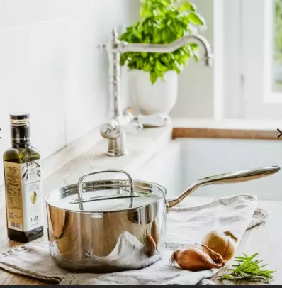 Av høy kvalitet med utmerket varmeledningsevne av tre-lags konstruksjon. Kroppen og håndtaket er i rustfritt stål og kasserollen tåler også ovnbruk (maks 200 °C). Produktet er egnet for alle typer kokeplater, inkludert induksjon.