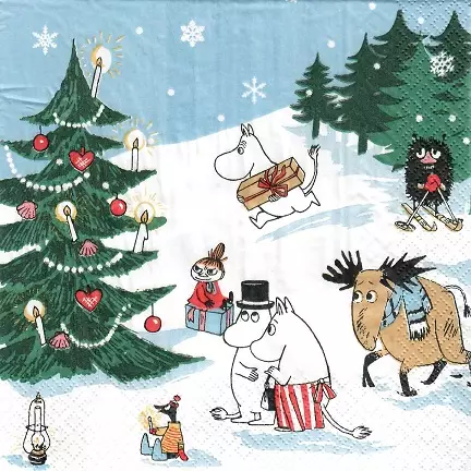 Havinslagte Mummitroll servietter, produsert av 3-lags myk papir med design. Serviettene er laget i Imatra og har Nøkkellappen.