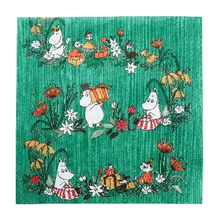 Havins designservietter med Mummitrollet-motiv laget av 3-lags myk papir. Serviettene er laget i Imatra og har Nøkkelpinnen.