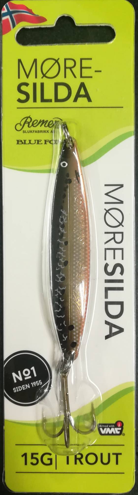 <p>Blue Fox Moresilda, utviklet i Norge i 1955, er en klassiker som fortsatt er svært effektiv for fiske etter ørret og laks. Den er en langtkastende sluk for laksefisk som ørret og laks. At klassikeren fremdeles er effektiv, bevises av 'TESTVINNER' i det norske tidsskriftet Alt om Fiske sin store sjøørretsluk-test. Moresildas sterke konstruksjon og tradisjonelle design sikrer at sluken fungerer godt selv i sterk strøm. De fine nyansene tilbyr en passende farge for alle fiskeforhold og vannforhold.- Effektiv sluk for laksefisk- Høykvalitets VMC-kroker- LangtkastendeModell: BFMS15Farge: Brown FoilVekt: 15g</p>