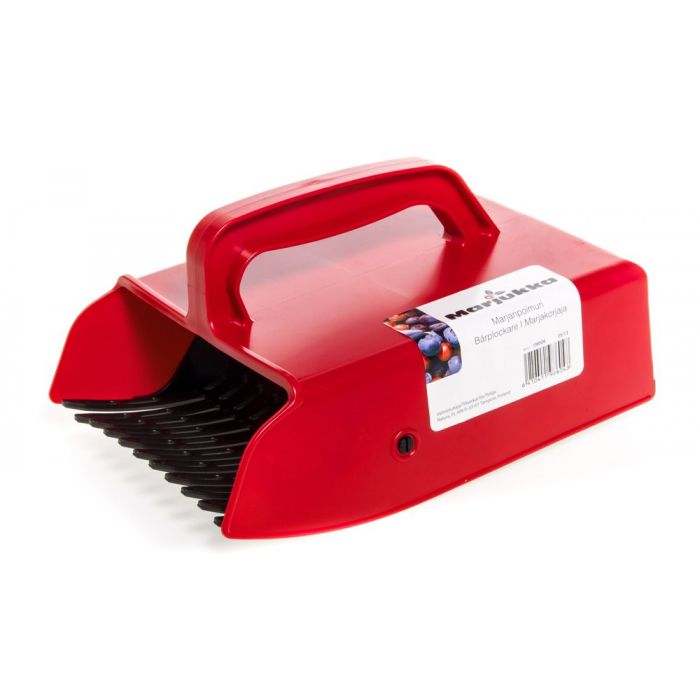 Marjukka bærplukker med plastpigger. Bred modell. Bredde17,5 cm Dybde24,5 cm Høyde13,5 cm Vekt0,3 kg Fargerød/svart MaterialeHIPS, ABS, TPR