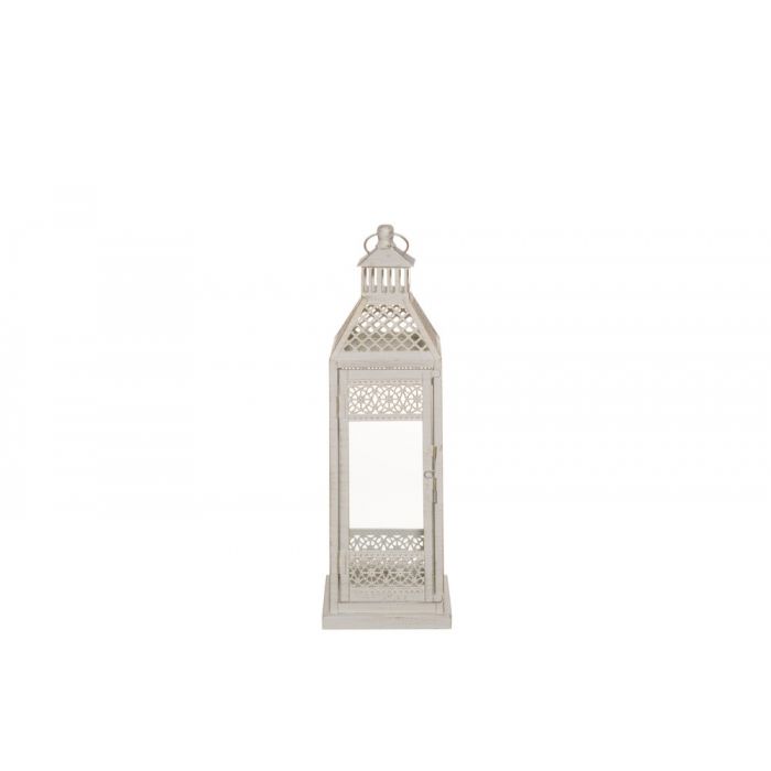 Helpi lykt har en vakker, romantisk dekorasjon. Den hvite fargen er forsterket med et hint av gull. Størrelse: 11x11x30cm. Materiale: jern, glass.