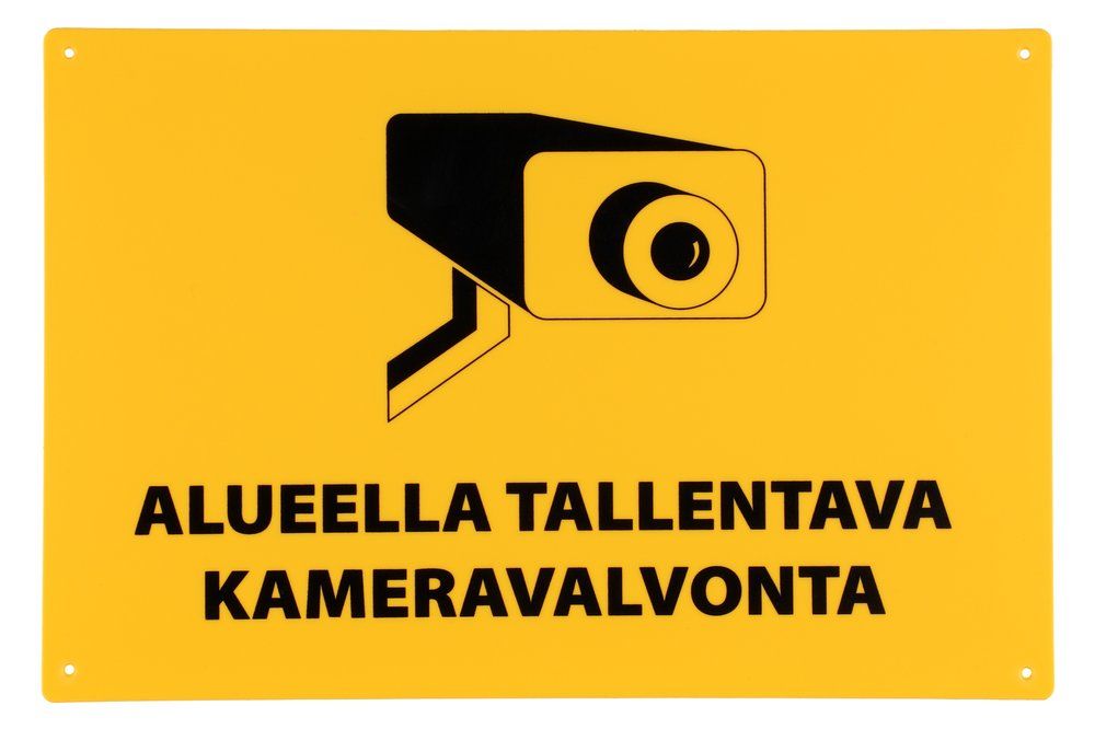 Plast varselskilt med tekst "Området overvåkes". Skiltet har også et bilde av et overvåkningskamera.Festehull i hjørnene av skiltet.Gul bakgrunnsfarge.Størrelse 30x20 cm... Les mer
