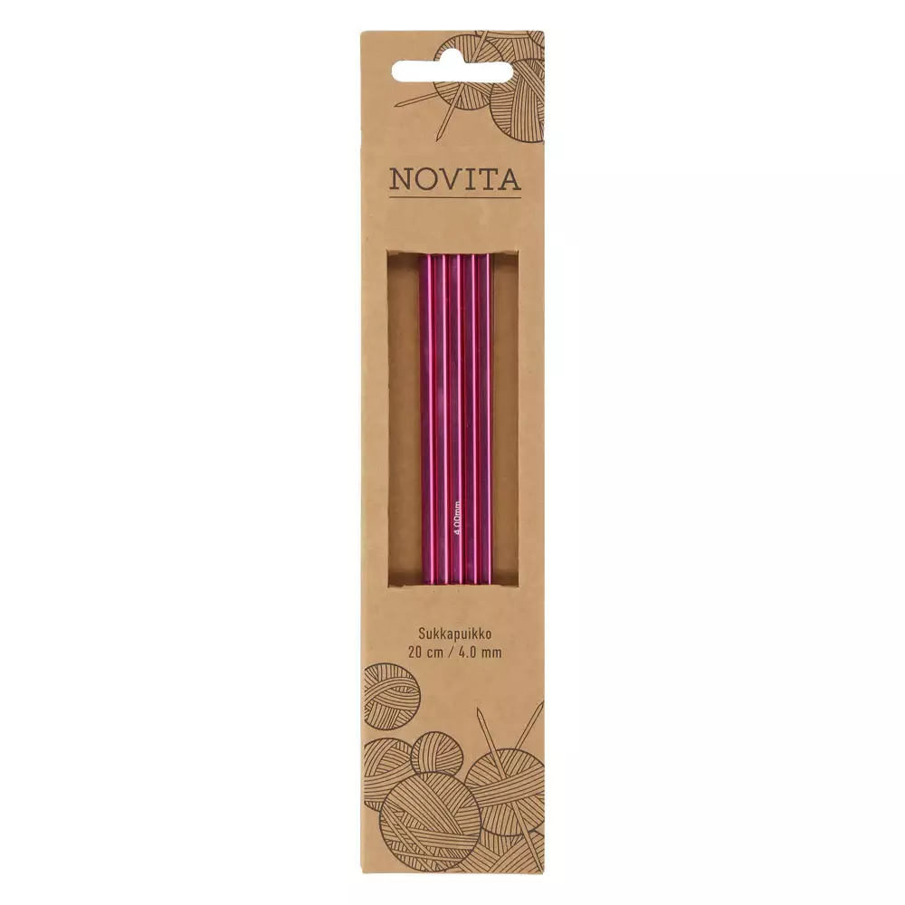 Novita strikkepinner 20 cm er utmerket for strikking av sokker, votter, luer og andre små strikkeprosjekter. De fargerike, metalliske strikkepinnene er laget av aluminium. Størrelse: 4,0mm Lengde: 20 cm Pakkeinnhold: Pakken inneholder 5 pinner